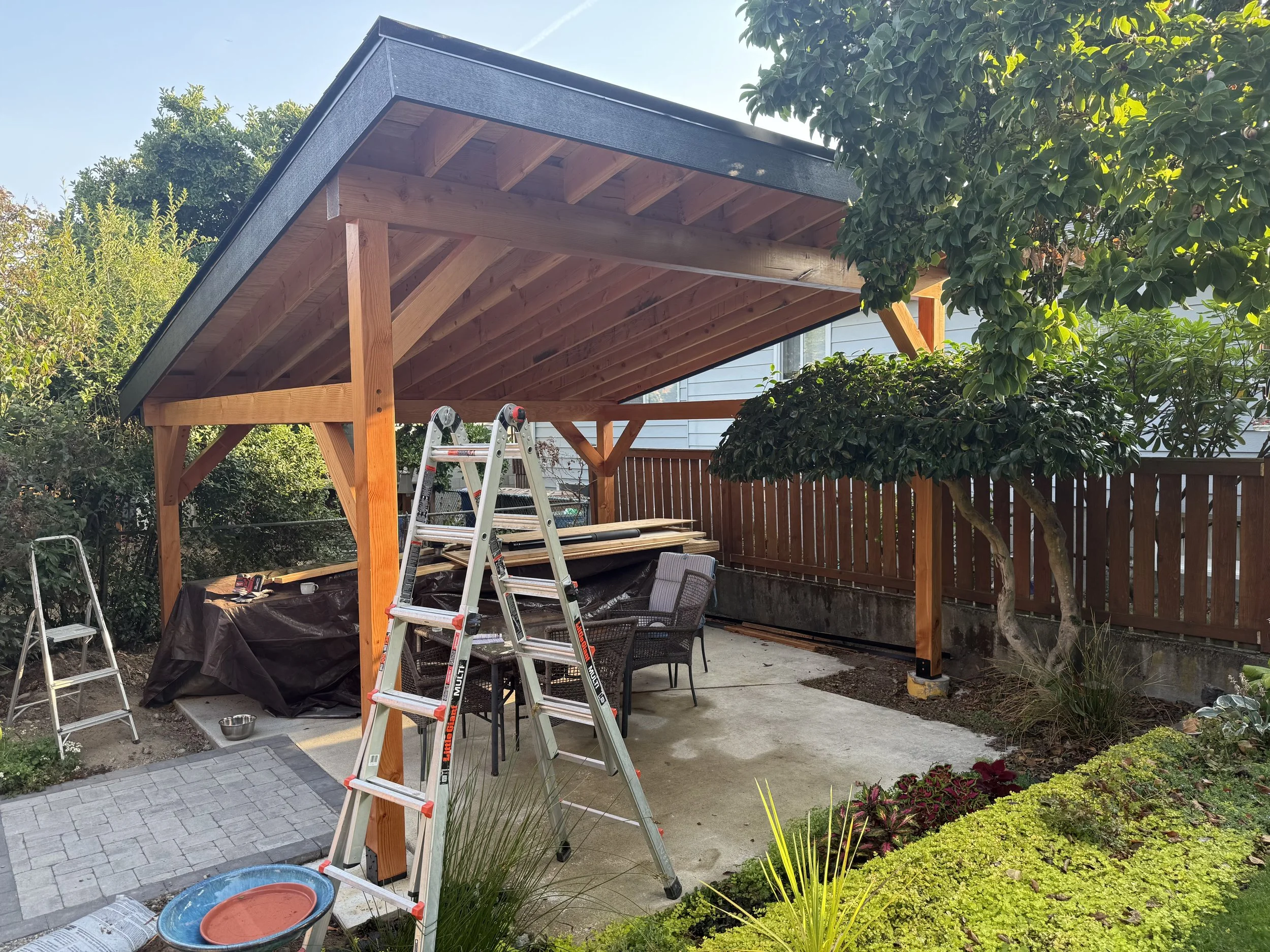 Yes — and we highly recommend it for Western Washington. A solid cover or pergola lets you use the patio rain or shine and protects your furniture, grill, and finishes from weather. We frame and build covers as part of the same project so everything ties together structurally and visually.